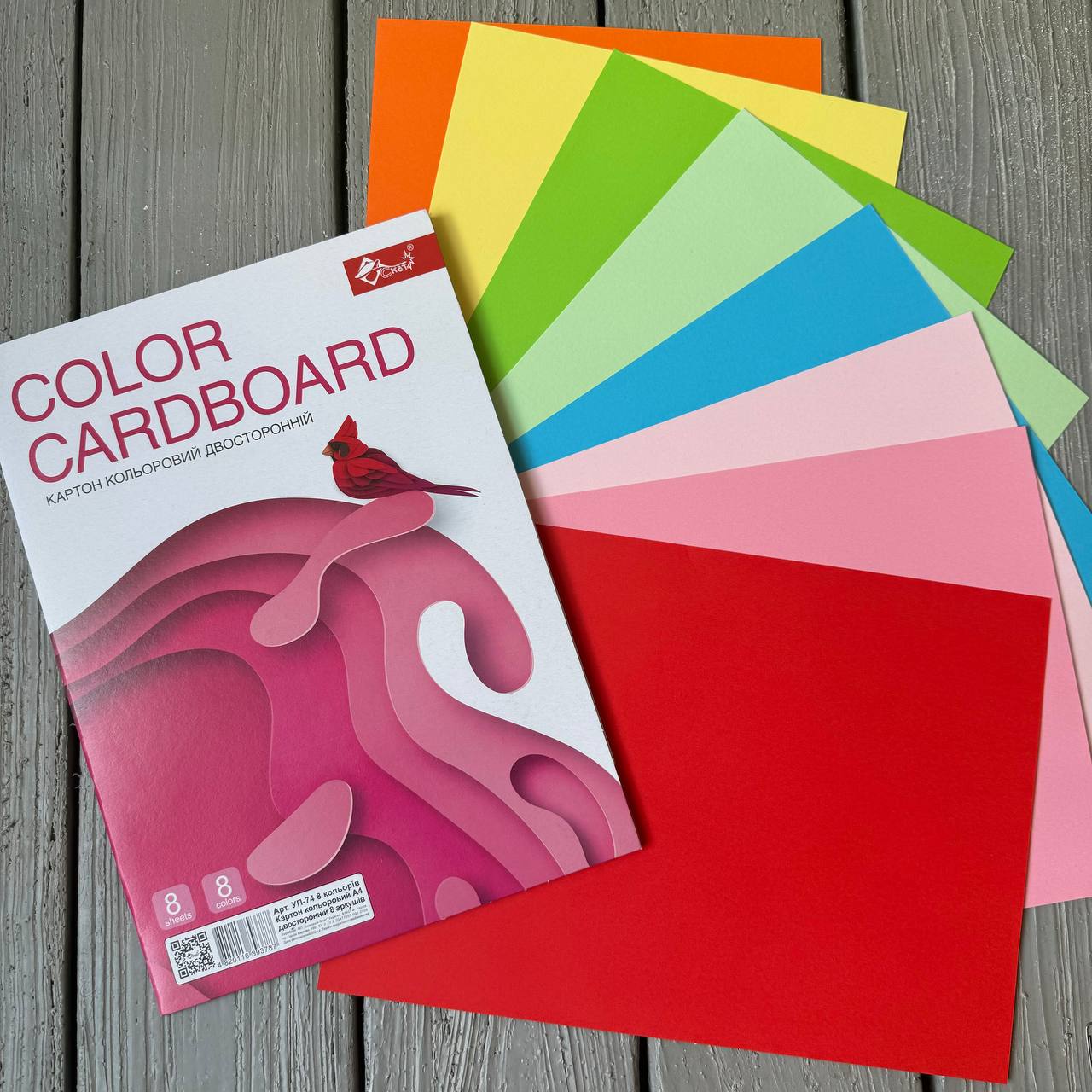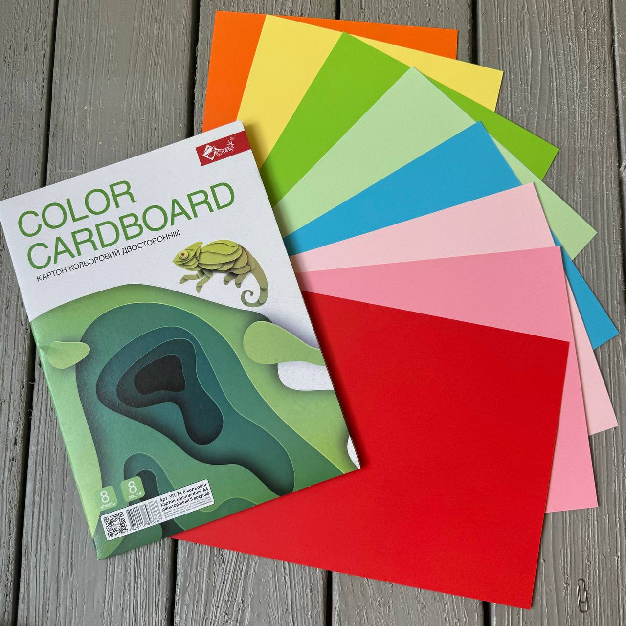 - Кольоровий картон ДВОСТОРОННІЙ А4, 8 кол.-8 арк.