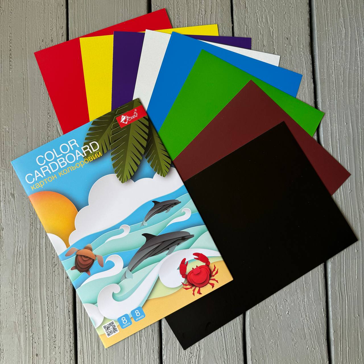 Кольоровий картон ОДНОСТОРОННІЙ А4, 8 кольорів, 8 арк/, обкладинка папка-конверт крейдований папір 90 г/м2, ТМ СКАТ