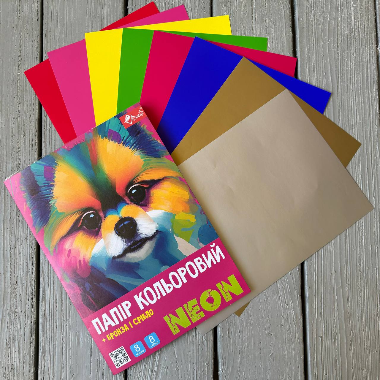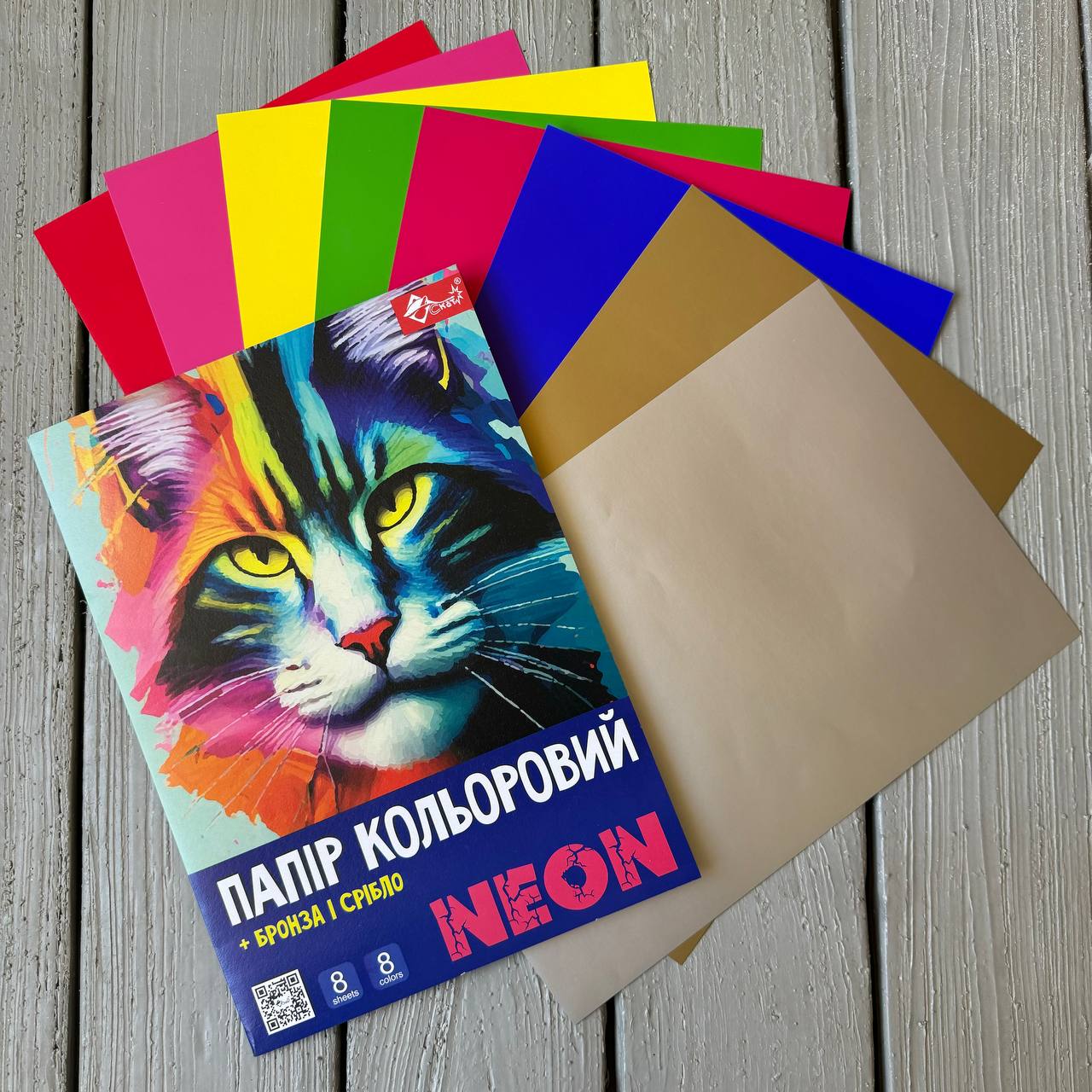 Кольоровий папір ОДНОСТОРОННІЙ А4, крейдований, NEON, 8 аркушів - 8 кольорів (у т.ч. срібло + бронза), картонна висічна папка-слайдер, ТМ СКАТ
